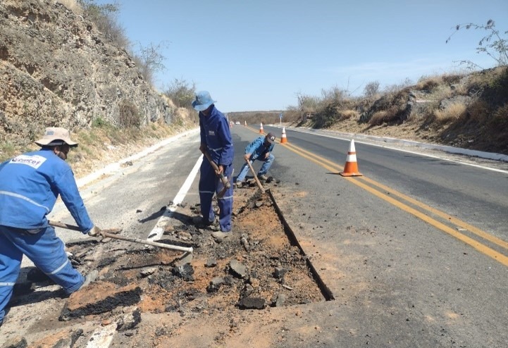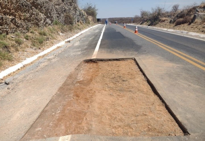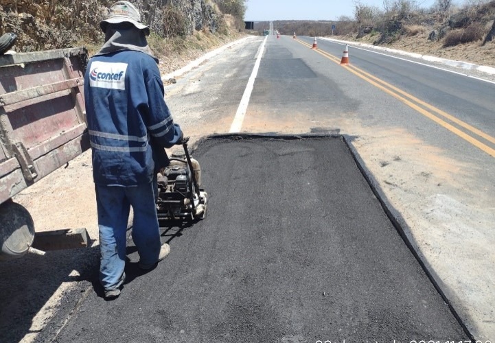 A Concessionária Estrada do Feijão vem realizando intervenções e corrigindo o aparecimento dos buracos em todo seu Sistema Rodoviário da BA-052 e BA-160. Com equipe qualificada para correções, é realizado a sinalização do local, feito a limpeza e retirada do material solto, em seguida o recorte abrangendo uma parte maior do buraco e na sequência é a realizado a reposição do pavimento e nivelado com rolo compactador.