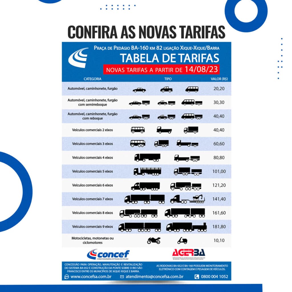 A Concessionária Estrada do Feijão, responsável pelo Sistema Rodoviário da BA-052, informou que a partir de 14 de agosto de 2023, haverá um reajuste nos valores das tarifas da Praça de Pedágio, de acordo com resolução da AGERBA publicado no Diário Oficial do Estado da Bahia no último sábado, 5 de agosto. Essa medida está em conformidade com o contrato de concessão 001/2018 SEINFRA, estabelecido em parceria com o Governo do Estado da Bahia.