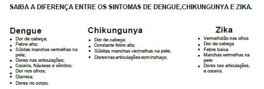 Saiba a diferença entre os sintomas de Dengue, Chikungunya e Zika.