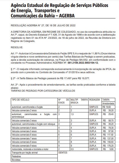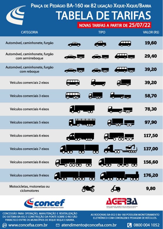 A partir desta segunda (25), o Pedágio São Francisco, localizado no km 82 da BA-160 e que interliga os municípios de Xique-Xique e Barra pela ponte Luiz Felipe de Souza Leão, receberá reajuste nas tarifas de todas as categorias de veículos, conforme publicado no Diário Oficial do Estado da Bahia, na edição desta terça (19).