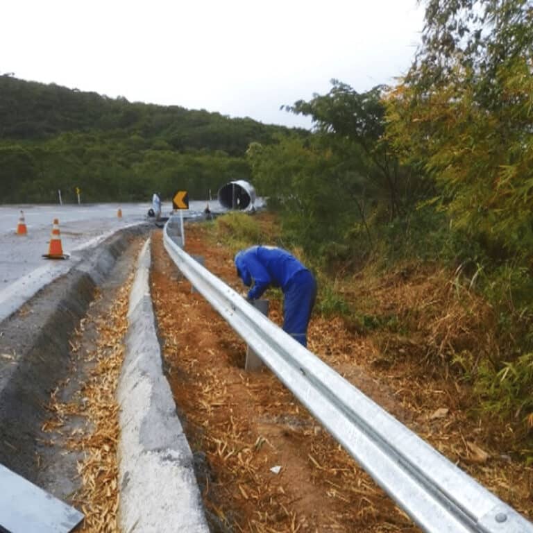 Concessionária faz manutenção em defensa metálica danificada após acidente
