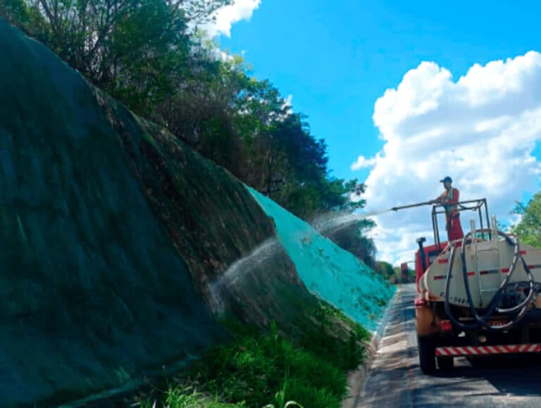 A Concessionária Estrada do Feijão executando uma operação de reaprumo e reinstalação de placas de sinalização ao longo...